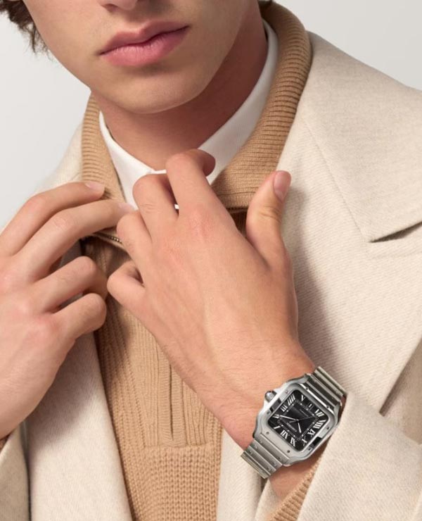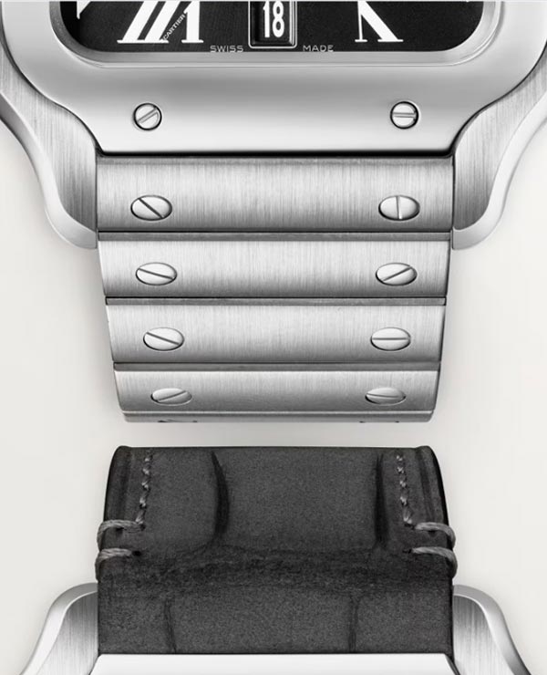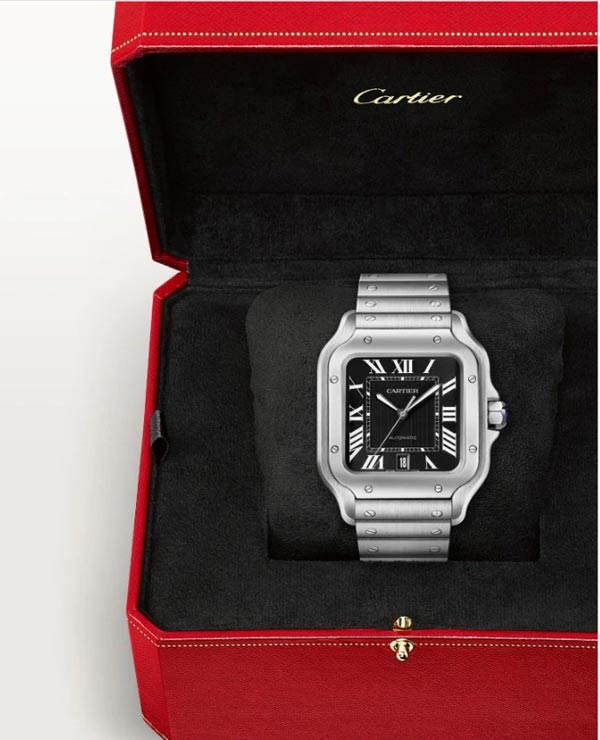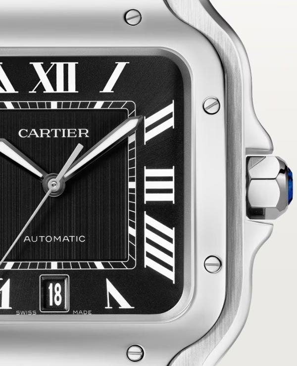 Montre Santos, grand modèle, mouvement mécanique à remontage automatique 1847 MC. Boîte en acier, couronne à 7 pans ornée d'un spinelle de synthèse facetté, cadran noir, aiguilles en forme de ...