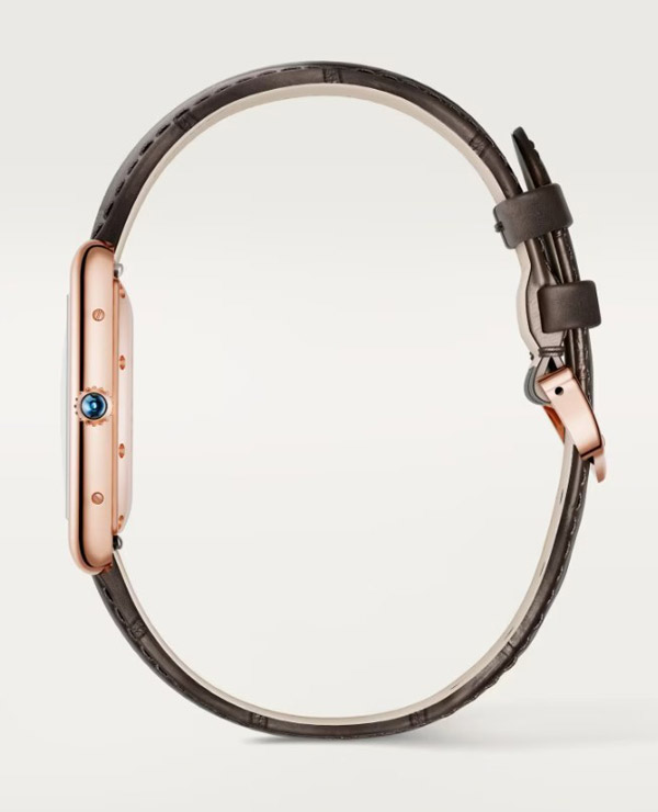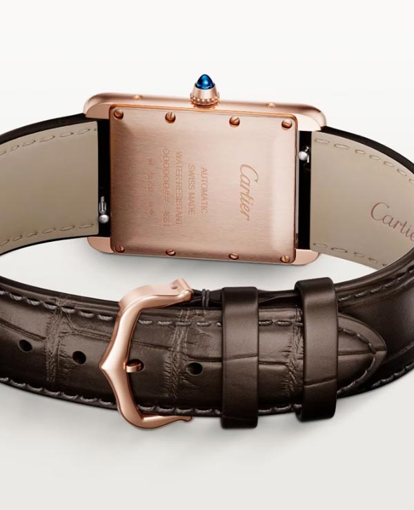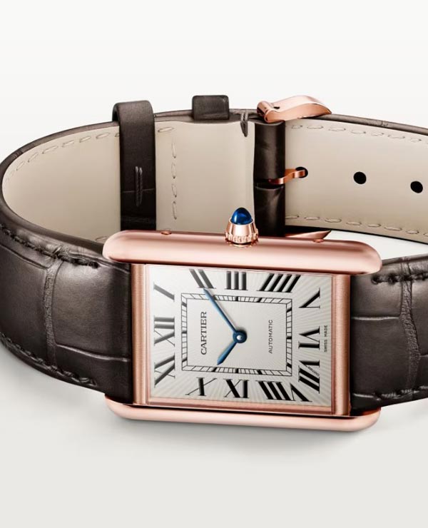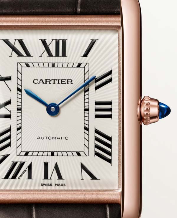Montre Tank Louis Cartier, grand modèle, mouvement mécanique à remontage automatique, calibre 1899 MC. Cadran argenté estampillé avec un vernis jaune. Aiguilles en forme de glaive en acier bleui....